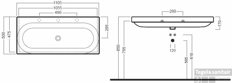 Wastafel 110.5×50 cm. z/kr.gat m/overloop