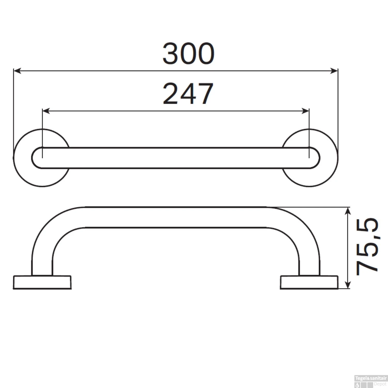 De hoogte van deze badgreep is 5,3 cm, de breedte is 30 cm en de diepte is 75,5 cm. Het uiteindelijke gewicht van deze badgreep is 217 gram. De badgreep is gemaakt van roestvrij staal, en dat alles met een Mat Witte kleur.