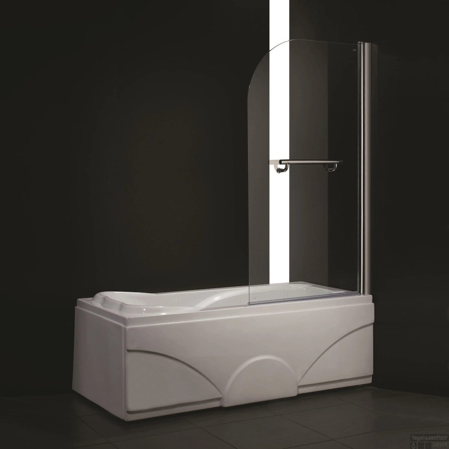 De afgeronde douchewand is gemaakt van 6mm dik veiligheidsglas. Met veiligheidsglas wordt bedoelt dat op het moment dat het glas onder druk komt te staan en knapt, dat er geen scherpe scherven ontstaan. Het glas breekt namelijk direct in honderden vierkante stukjes. Het blijft natuurlijk glas, maar kleine stukjes zijn minder gevaarlijk dan scherpe scherven. Verder is de wand voorzien van een lange elegante handgreep en om het water in uw badkuip te houden zit er aan de onderkant van de badwand een strip. Dit beweegt mee zodra uw de badwand laat scharnieren. De wand is zowel naar rechts als links te scharnieren.