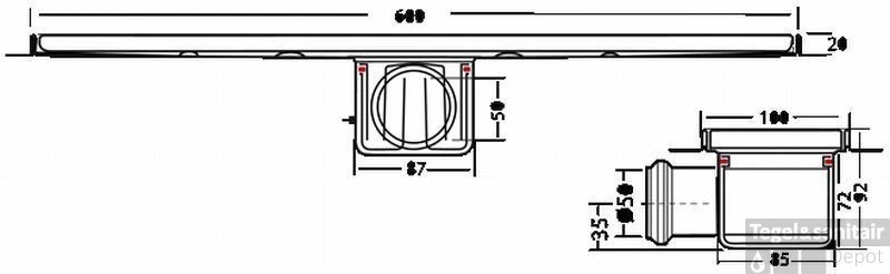 Afvoergoot 60 cm. met flens zijafvoer 50 mm.