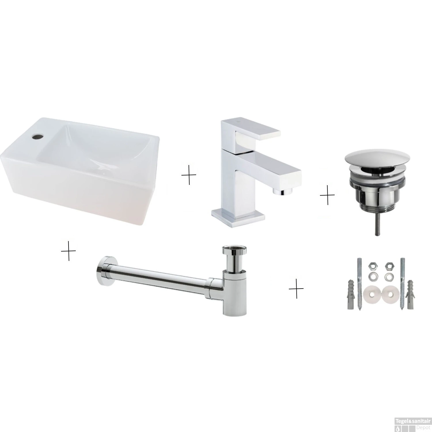 De set bestaat uit: fontein wit links, toiletkraan vierkant keramiek chroom, luxe vaste waste, luxe sifon laag chroom en een plugboutenset. De fontein heeft 1 kraangat, is zonder overloop. Het materiaal van de fontein en toiletkraan is keramiek. Keramiek is noch metaal of polymeer en bevatten goede mechanische eigenschappen. Het is hard en heeft een hoge vloeigrens. Met uitzonderingen daargelaten is keramiek slijtvast, hittebestendig, non-elektrisch, non-magnetisch en non-metalisch.