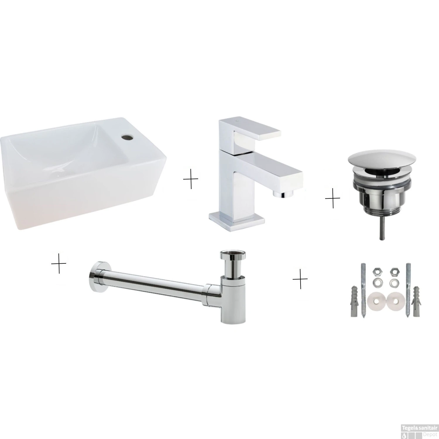 De set bestaat uit: fontein wit rechts, toiletkraan vierkant keramiek chroom, luxe vaste waste, luxe sifon laag chroom en een plugboutenset. De fontein heeft 1 kraangat, is zonder overloop. Het materiaal van de fontein en toiletkraan is keramiek. Keramiek is noch metaal of polymeer en bevatten goede mechanische eigenschappen. Het is hard en heeft een hoge vloeigrens. Met uitzonderingen daargelaten is keramiek slijtvast, hittebestendig, non-elektrisch, non-magnetisch en non-metalisch.