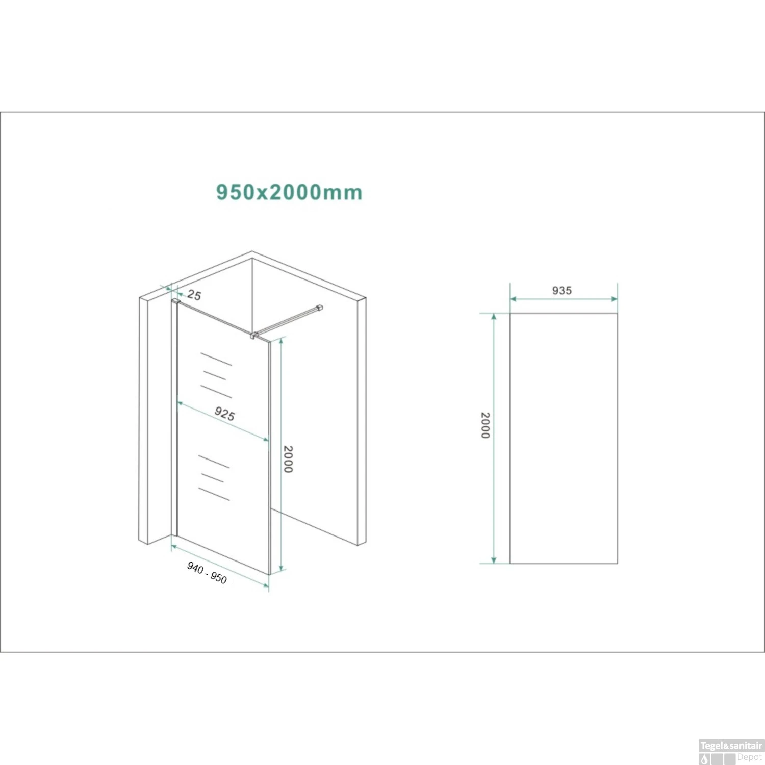 BWS Inloopdouche Pro Line Helder Glas 95×200 Mat Wit Profiel en Stabilisatiestang