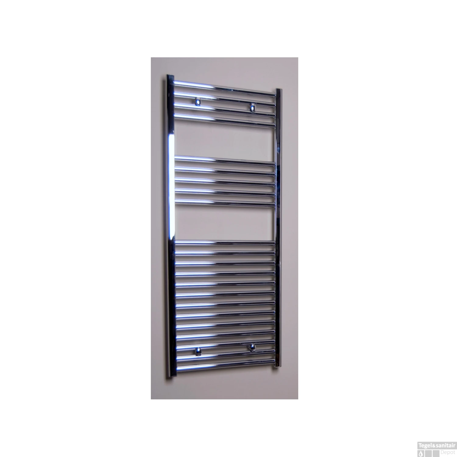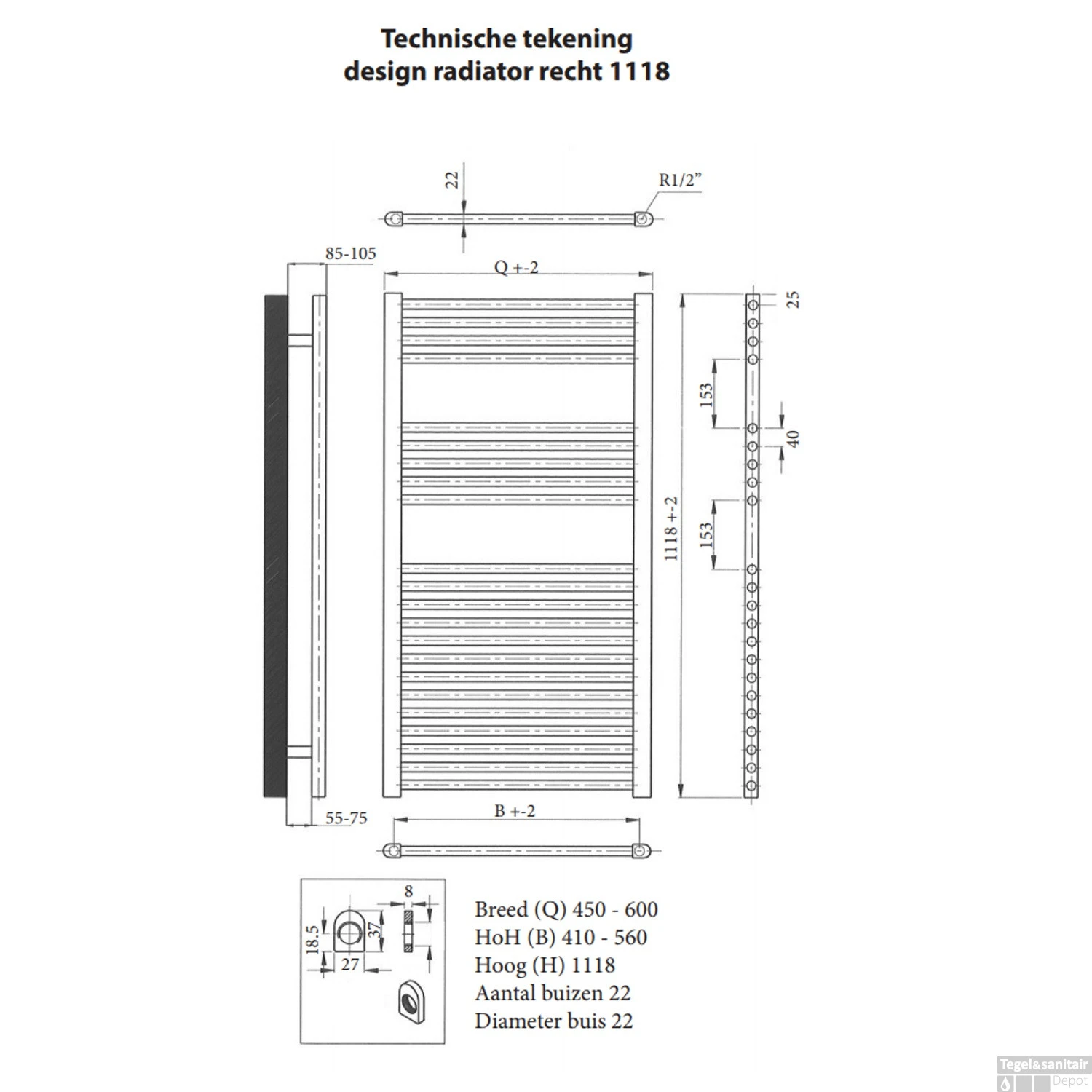 De radiator heeft een hoogte van 111,8 cm en een breedte van 45 cm en is zodoende perfect voor elke badkamer! De radiator is aan te sluiten aan de onder- of bovenzijde. Bovendien vindt u een afsluiter en een ontluchter voor de twee aansluitpunten die niet gebruikt zullen worden en worden er vier montagebeugels meegeleverd. De hart-op-hart afstand van de designradiator bedraagt 41 cm. Het artikel is beschikbaar in de kleuren wit, inox-look, zilvergrijs, chroom en mat zwart.