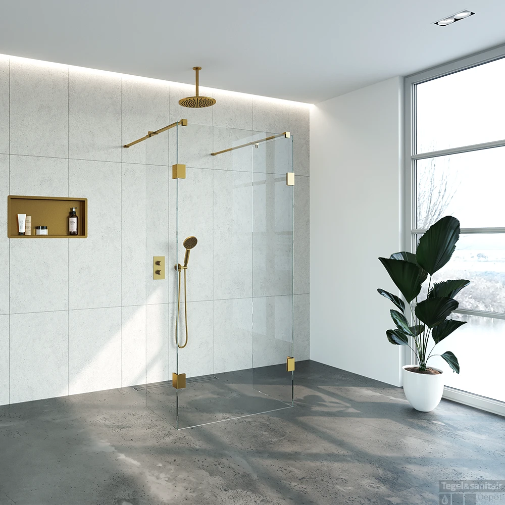 Als u graag minimalisme in uw badkamer wilt, is een doorloopdouche een goede keuze. Deze complete doorloopdouche bestaat uit een doorloopwand met twee vaste zijwanden. De doorloopwand is 100 cm breed en 200 cm hoog. De zijwanden zijn beide ongeveer 50 cm breed. Inclusief glasbehandeling. Deze doorloopdouche straalt luxe en rust uit door zijn design en Goudkleur accenten.