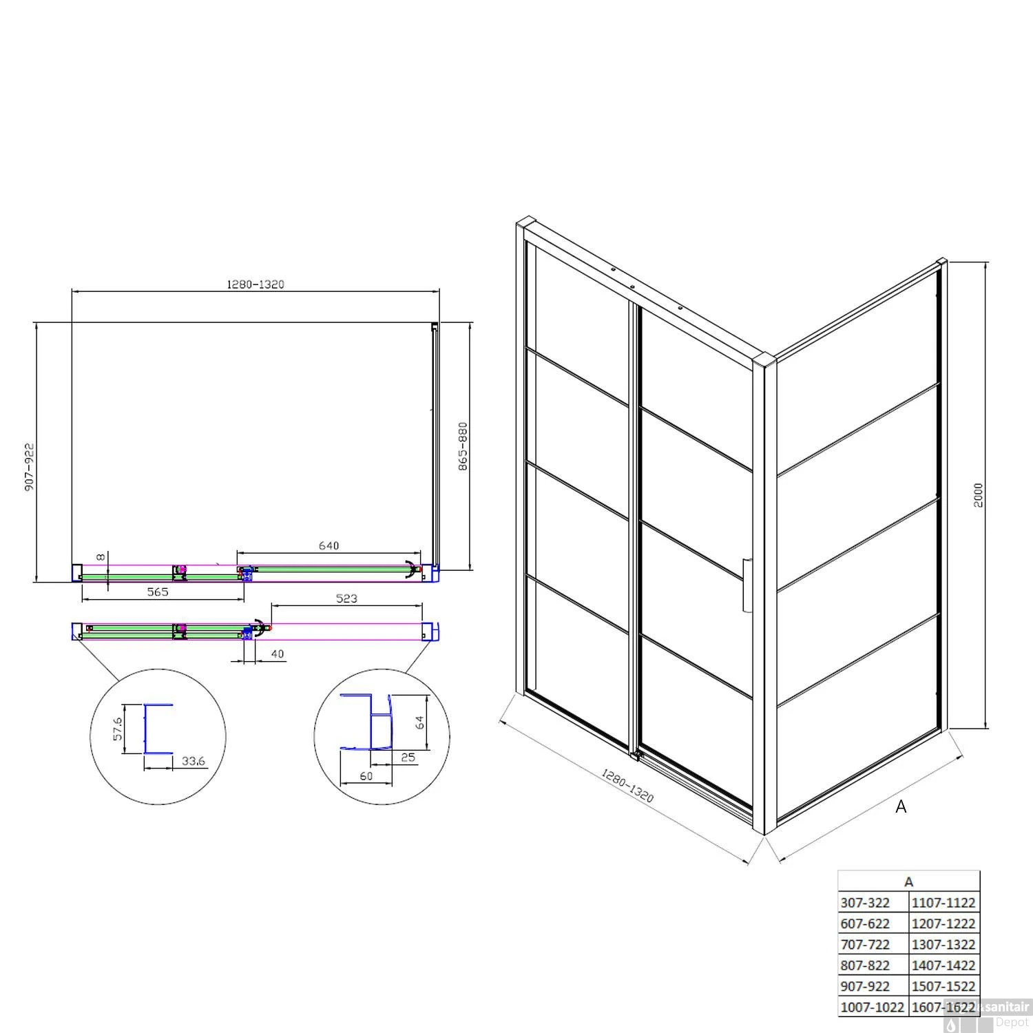 Specificaties Douchecabine Boss & Wessing Frame met Schuifdeur en Vaste Wand: