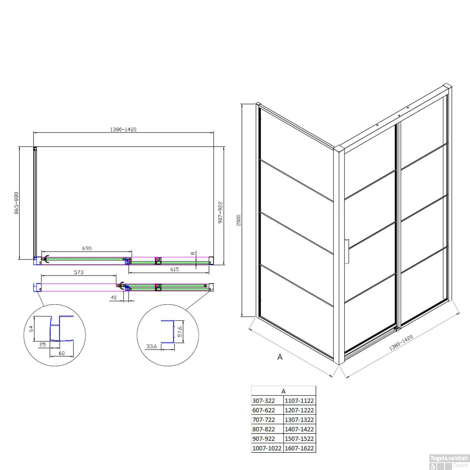 Specificaties Douchecabine Boss & Wessing Frame met Schuifdeur en Vaste Wand: