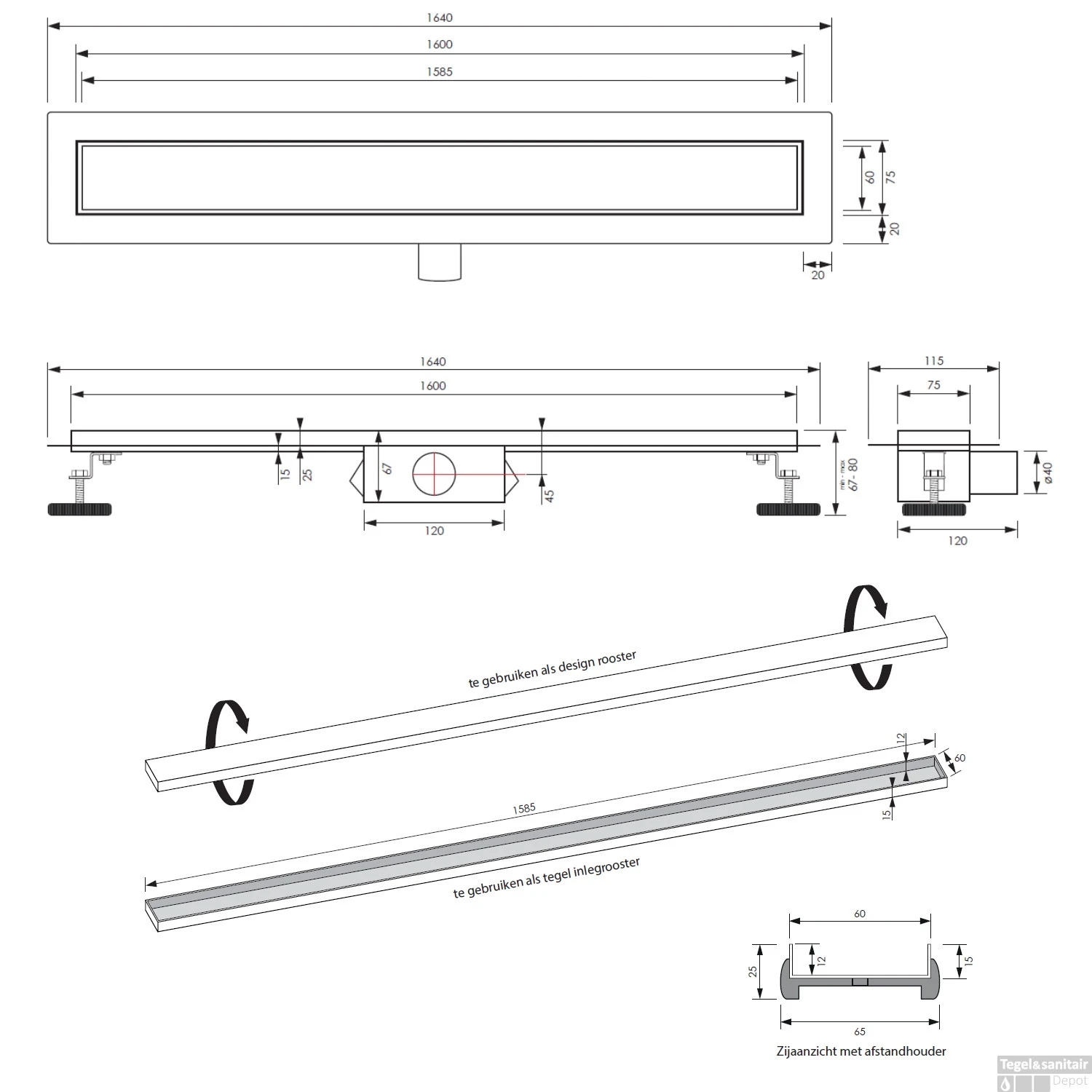 Specificaties Douchegoot Brauer Zero RVS Inclusief Vloerflens 160×7 cm Tegelinlegrooster Omkeerbaar