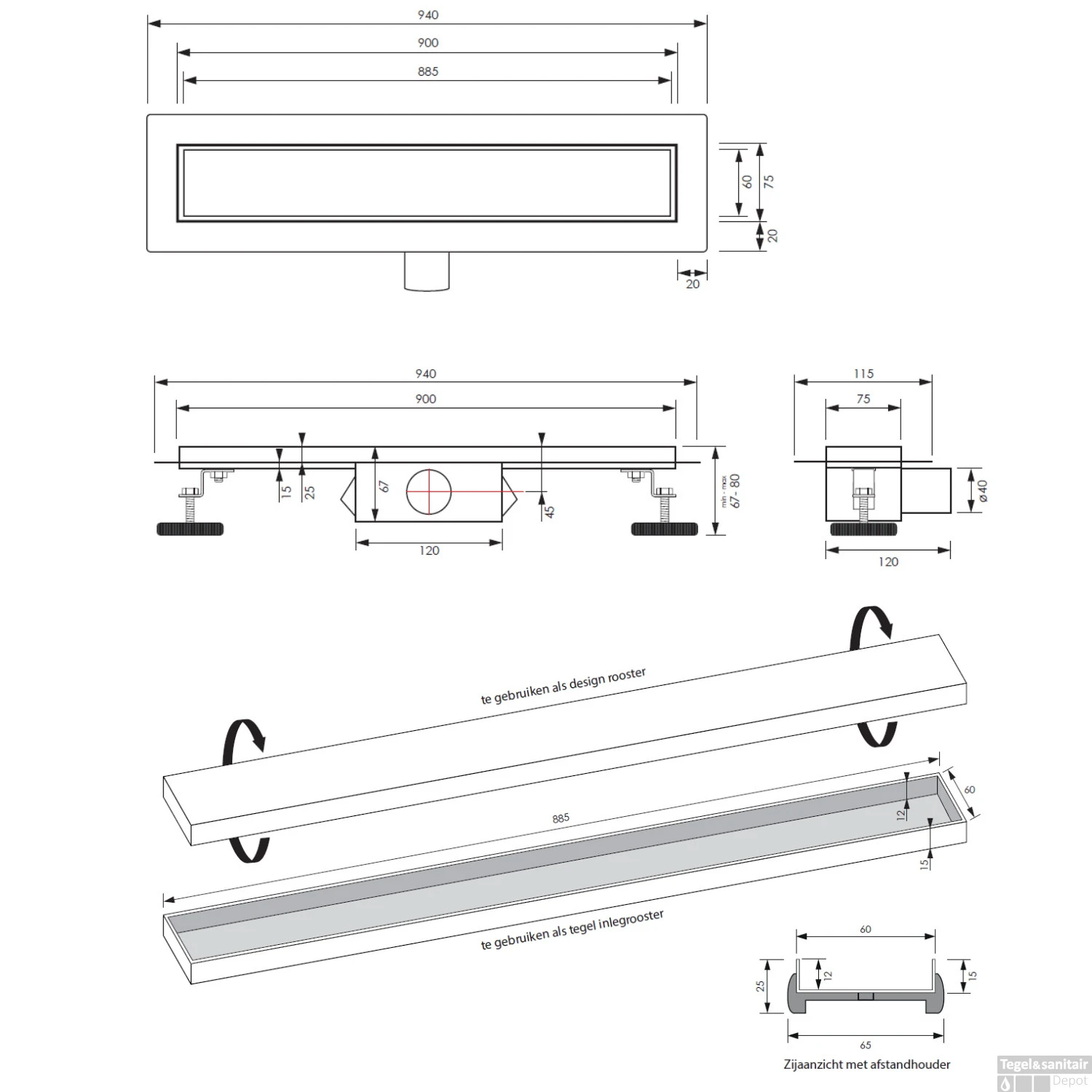 Ook wordt de douchegoot geleverd inclusief sifon (kunststof), waterdichtdoek en een sleutel om het rooster er gemakkelijk uit te halen wanneer nodig. De douchegoot wordt geleverd inclusief vloerflens, dit is de rand om het rooster heen die zorgt voor een beter afsluiting. U kunt deze douchegoot ook in hoogte naar wens afstellen door middel van de verstelbare pootjes die erbij worden geleverd.