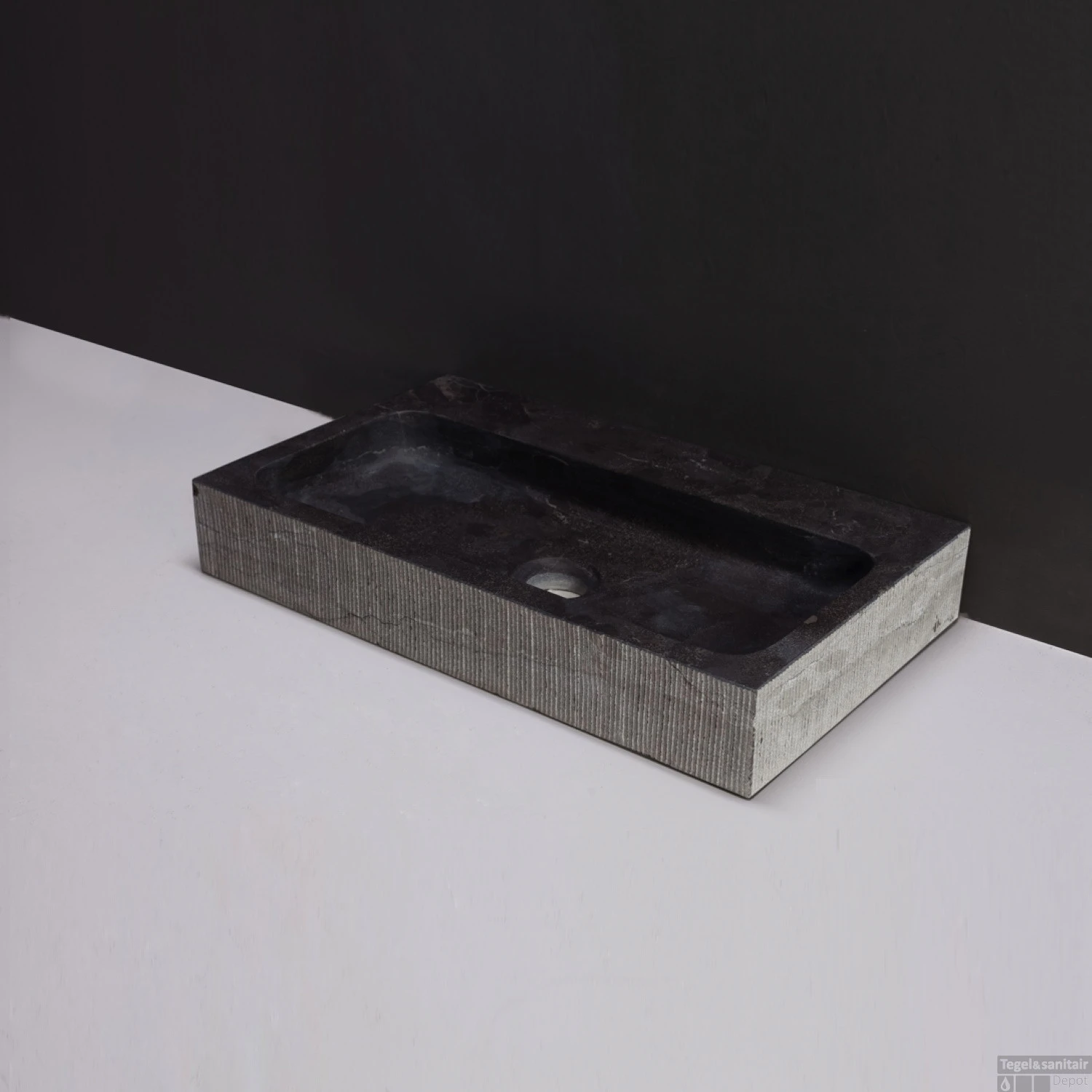 Deze schitterende natuursteen wastafel wordt geleverd inclusief kraangat waardoor u een opbouw kraan toe kunt voegen. De wastafel is gefrijnd, dat is een sierbewerking waarbij er groeven de wastafel worden toegevoegd, zoals te zien is aan de zijkanten.