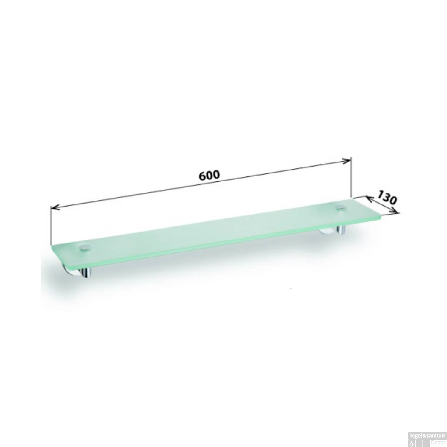 Het product heeft een afmeting van 60×6.5×13 cm (BxHxD) en is gemaakt van verchroomd messing in de kleur chroom met een plankje van melkglas.