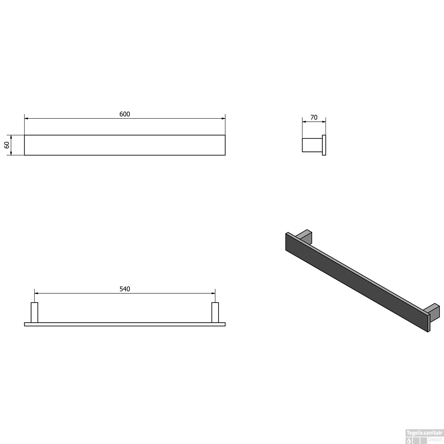 De handdoekhouder is 60 cm breed en 6 cm hoog. De houder komt 7 cm van de muur af en wordt aan de muur bevestigt met schroeven.