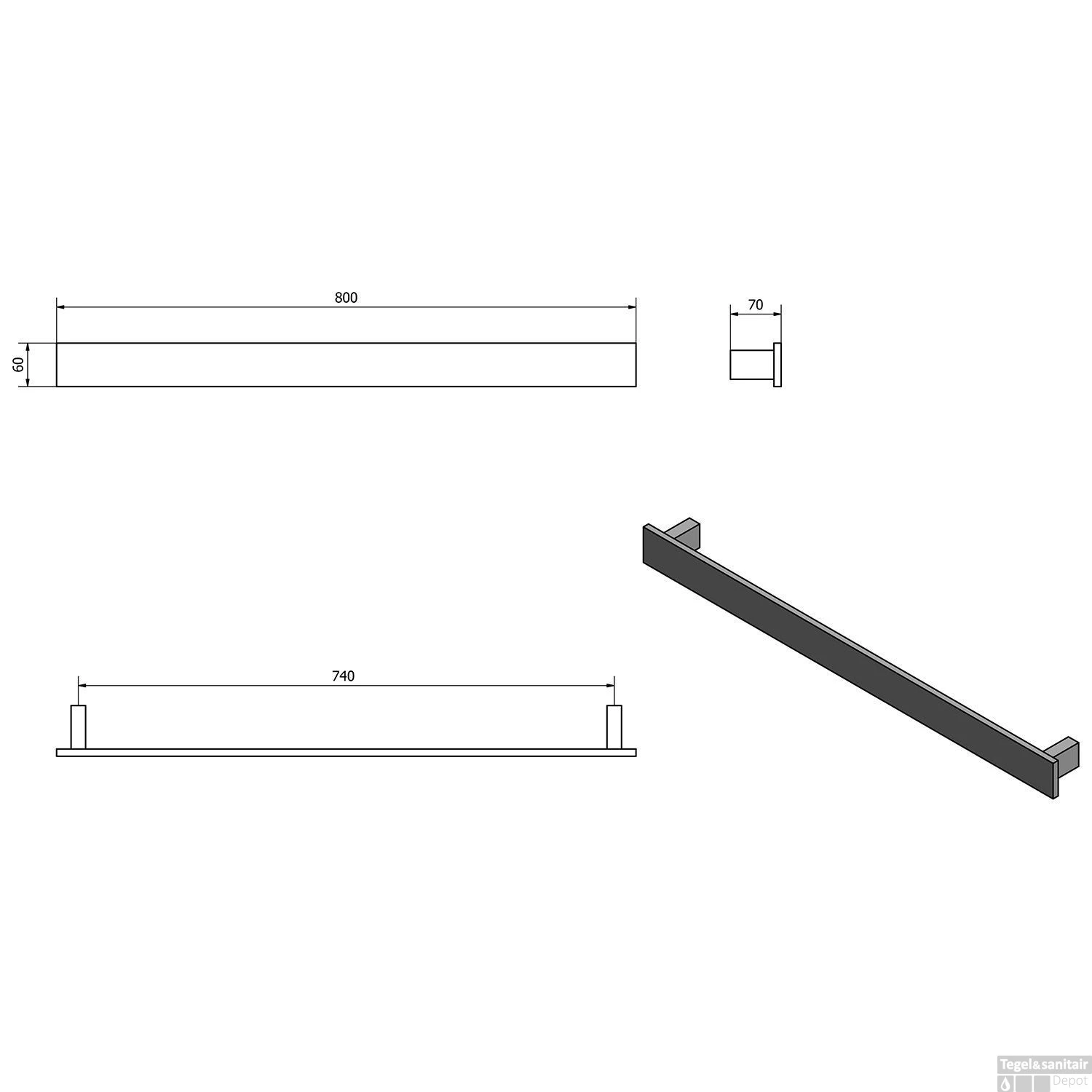 De handdoekhouder is 80 cm breed en 6 cm hoog. De houder komt 7 cm van de muur af en wordt aan de muur bevestigt met schroeven.