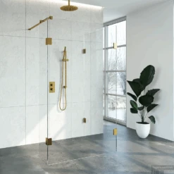 Deze complete inloopdouche bestaat uit twee inloopwanden en en een zijwand met Goud beslag. Inclusief glasbehandeling. De hoogte van de inloopdouche is 200 cm. Hij is 118,3 cm breed en 97,7 cm diep. Deze inloopdouche straalt luxe uit door zijn design en kleur.