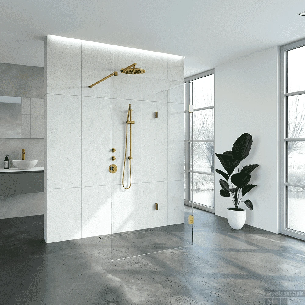 Deze complete inloopdouche bestaat uit twee inloopwanden met Goud beslag. Inclusief glasbehandeling. De hoogte van de inloopdouche is 200 cm. Hij is 108,3 cm breed en 87,7 cm diep. Deze inloopdouche straalt luxe uit door zijn design en kleur.
