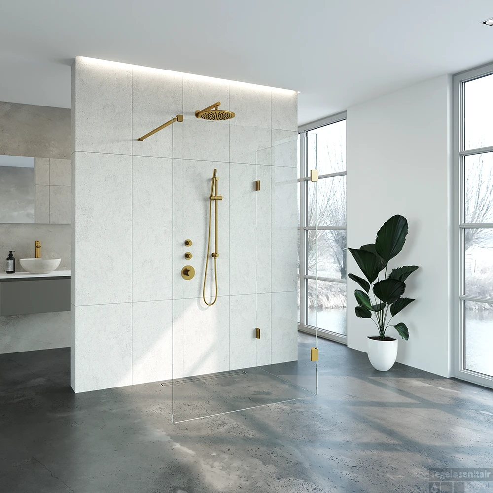 Deze complete inloopdouche bestaat uit twee inloopwanden met Goud beslag. Inclusief glasbehandeling. De hoogte van de inloopdouche is 200 cm. Hij is 118,3 cm breed en 87,7 cm diep. Deze inloopdouche straalt luxe uit door zijn design en kleur.