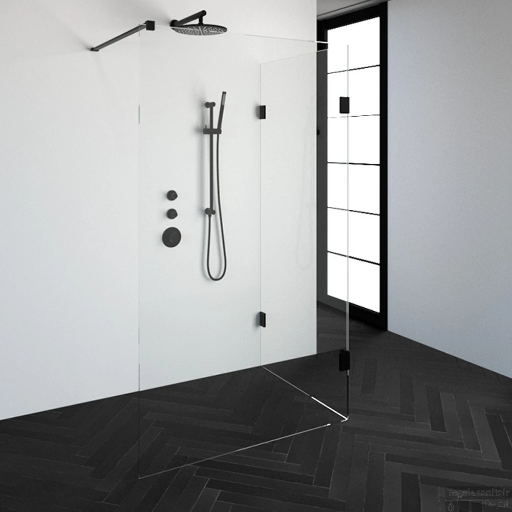 Deze complete inloopdouche bestaat uit twee inloopwanden met Mat Zwart beslag. Inclusief glasbehandeling. De hoogte van de inloopdouche is 200 cm. Hij is 118,3 cm breed en 87,7 cm diep. Deze inloopdouche straalt luxe uit door zijn design en kleur.