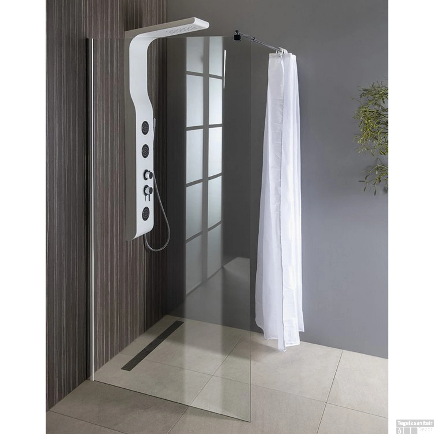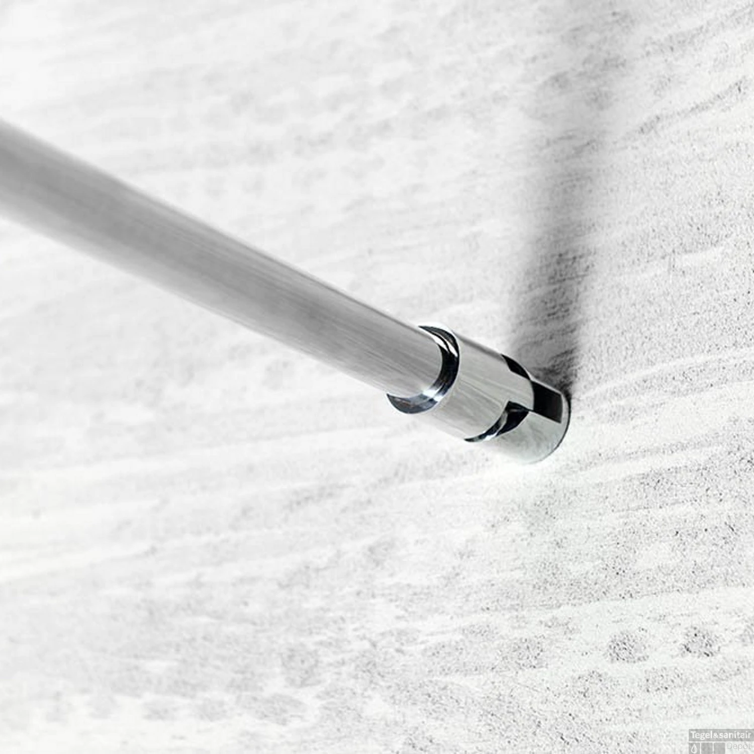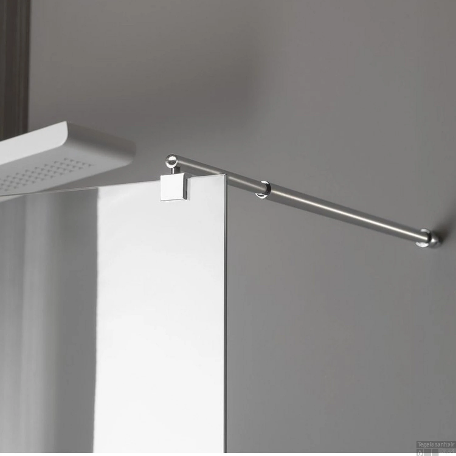 De douchewand heeft geen vloerbevestiging, waardoor u de wand direct na het plaatsen kunt afkitten. De stabilisatiestang wordt meegeleverd en is universeel toepasbaar.