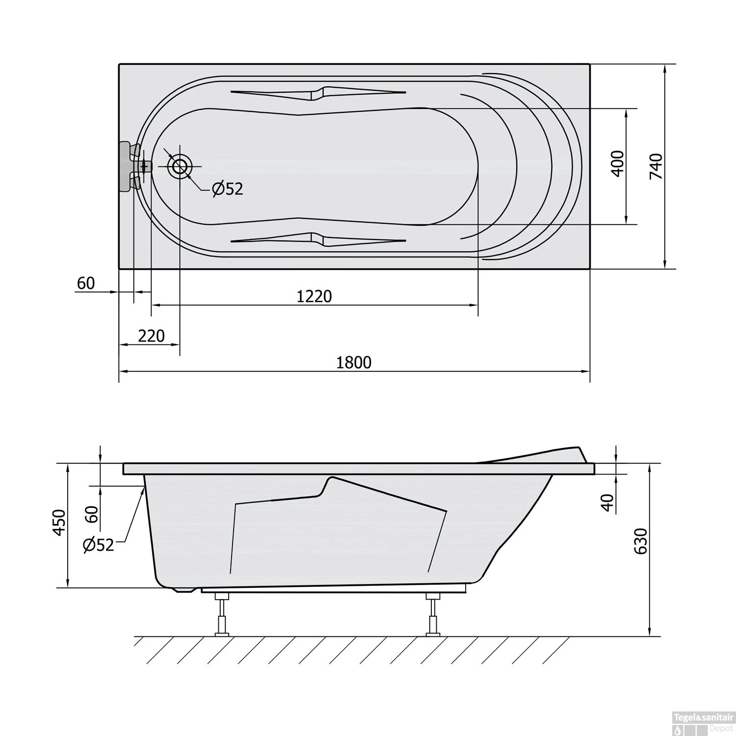 Het bad heeft een lengte van 180 cm, een breedte van 74 cm en een totale hoogte van 45 cm. Het bad wordt geleverd exclusief sifon, waste en badpoten. Deze kunt u eenvoudig mee bestellen.