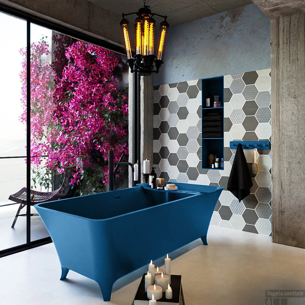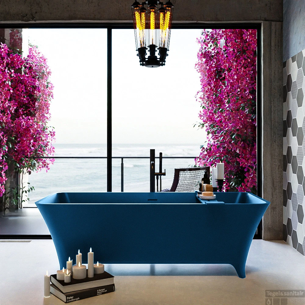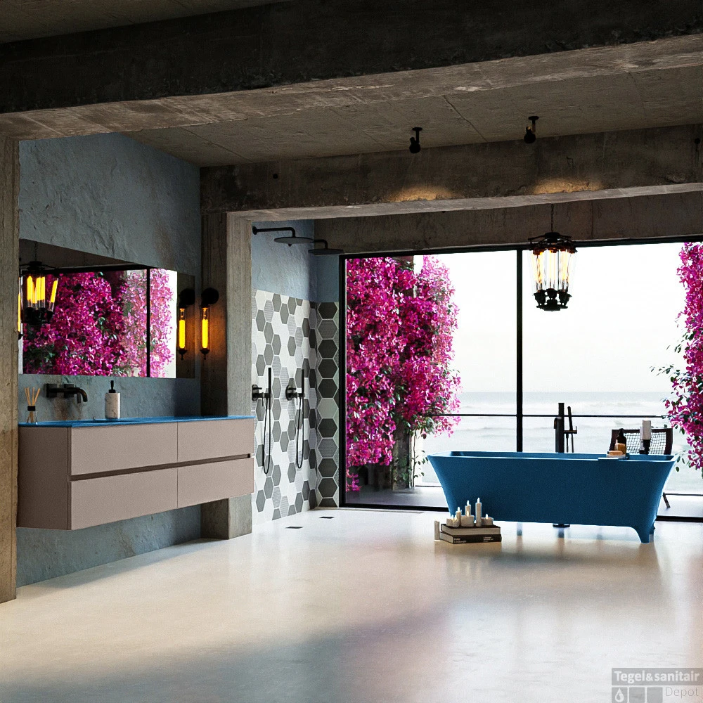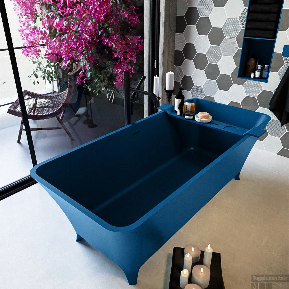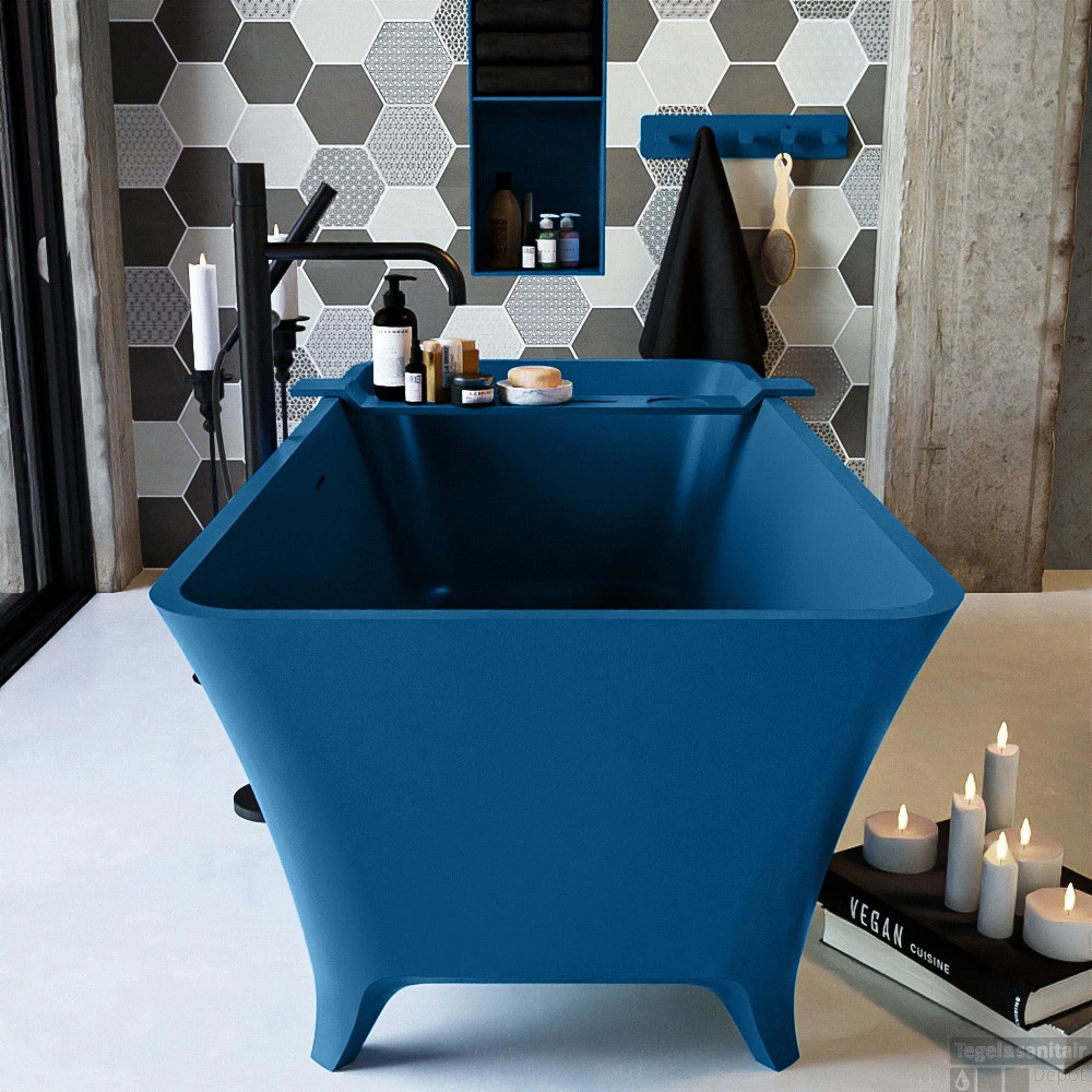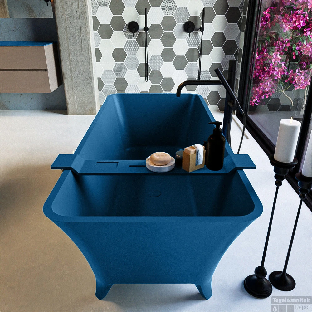 Een bad op pootjes die geweldig staat in elke badkamer. De vorm leent zich voor vrijstaand en half vrijstaand. Deze schitterende opstelling is gecombineerd met het badmeubel VICA zowel de Solid Surface wastafel als het meubel kan in exacte dezelfde kleur als het bad. Zo breng je kleur in je badkamer.