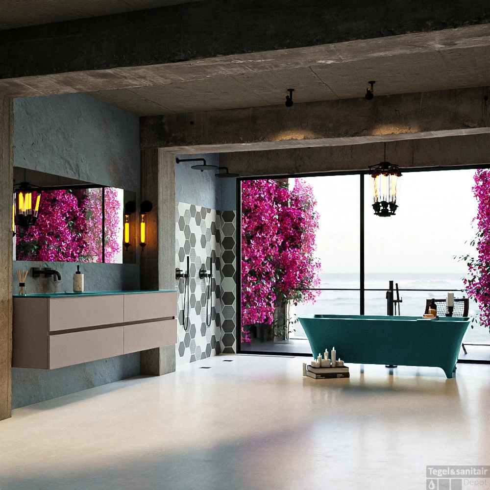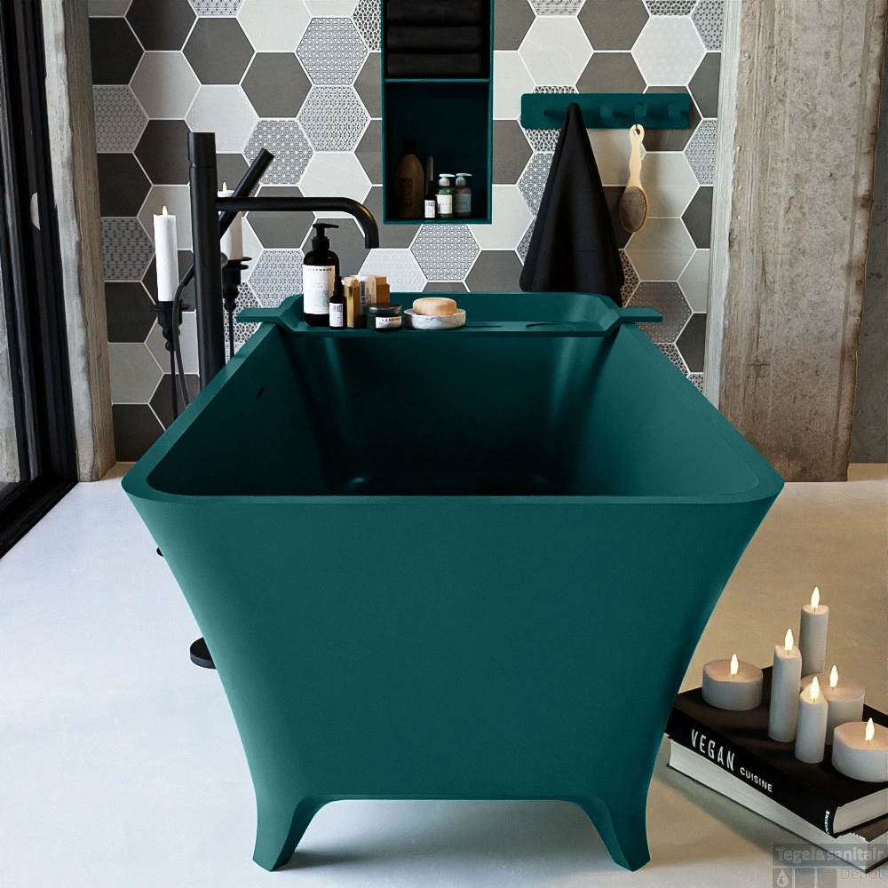Een bad op pootjes die geweldig staat in elke badkamer. De vorm leent zich voor vrijstaand en half vrijstaand. Deze schitterende opstelling is gecombineerd met het badmeubel VICA zowel de Solid Surface wastafel als het meubel kan in exacte dezelfde kleur als het bad. Zo breng je kleur in je badkamer.