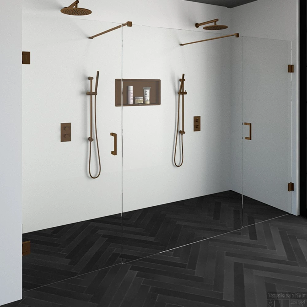 Deze complete niscabine bestaat uit een vrijstaande doorloopwand met twee draaideuren met Koper beslag. Inclusief glasbehandeling en optionele kunststof profielen. De hoogte van de niscabine is 200 cm. Deze niscabine is modern straalt luxe uit door zijn design en kleur.