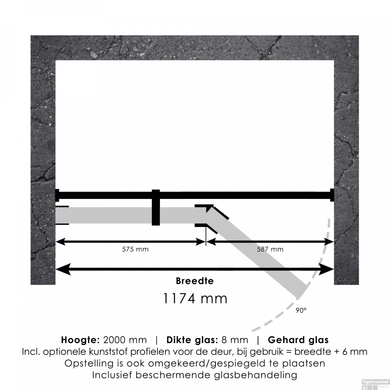 Deze complete nisdeur bestaat uit een inloopwand en draaideur met Chroom beslag. Inclusief glasbehandeling en optionele kunststof profielen. De hoogte is 200 cm. Deze nisdeur straalt luxe uit door zijn design en kleur. De draaideur wordt met een glasscharnier bevestigd op de inloopwand.
