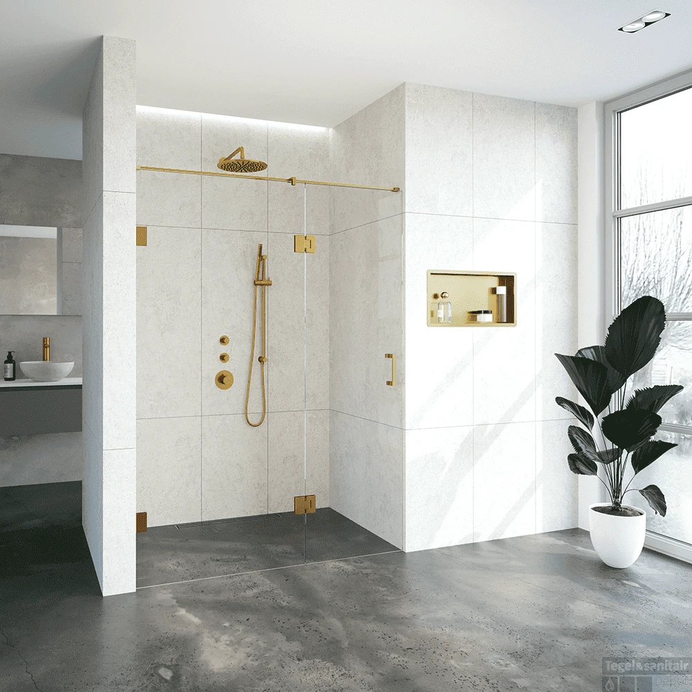 Deze complete nisdeur bestaat uit een inloopwand en draaideur met Goud beslag. Inclusief glasbehandeling en optionele kunststof profielen. De hoogte is 200 cm. Deze nisdeur straalt luxe uit door zijn design en kleur. De draaideur wordt met een glasscharnier bevestigd op de inloopwand.
