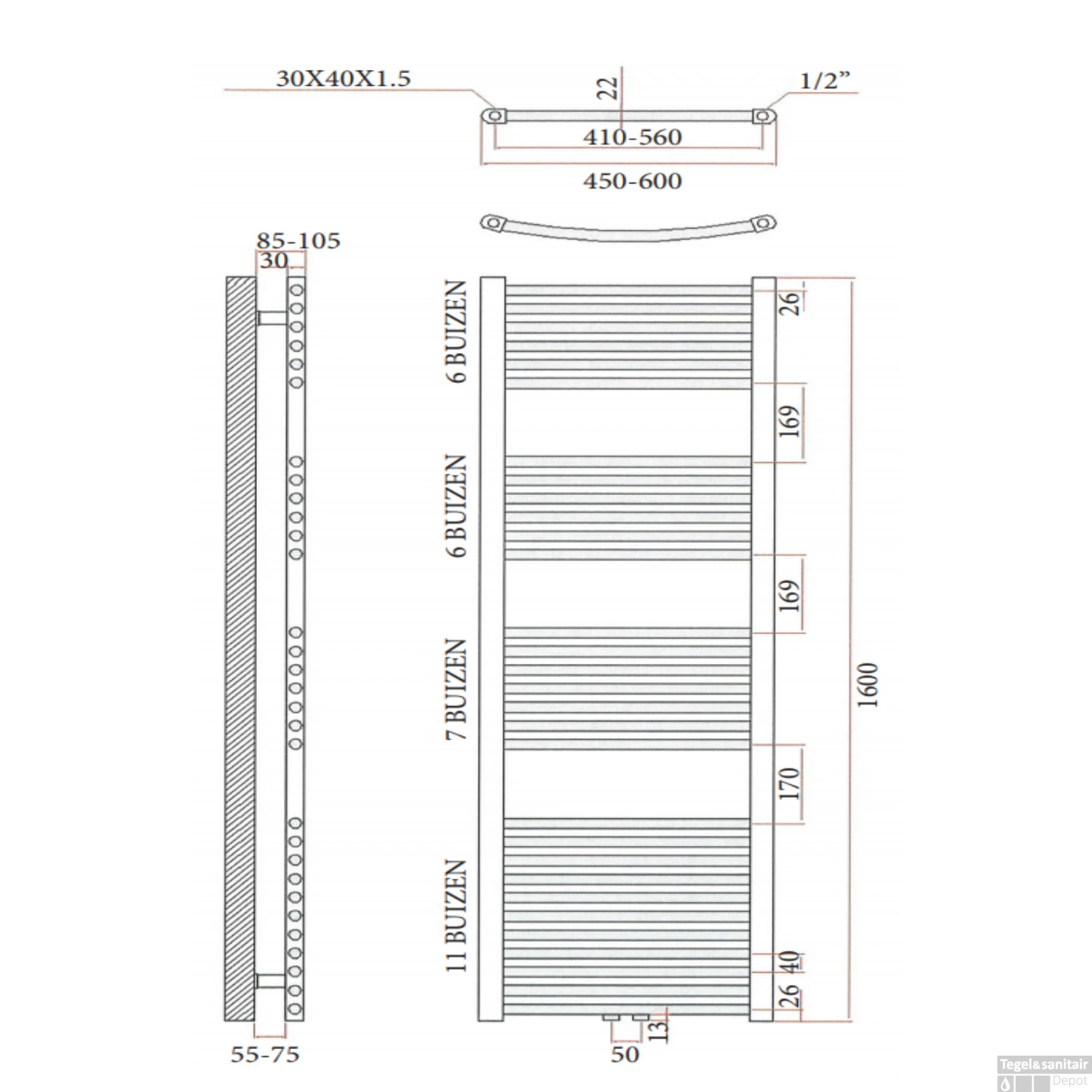 De radiator heeft een hoogte van 160 cm en een breedte van 45 cm en is zodoende perfect voor elke badkamer! De radiator is aan het midden aan te sluiten. Bovendien vindt u drie afsluiters en een ontluchter voor de aansluitpunten die niet gebruikt zullen worden en worden er vier montagebeugels meegeleverd. De hart-op-hart afstand bedraagt 5 cm.