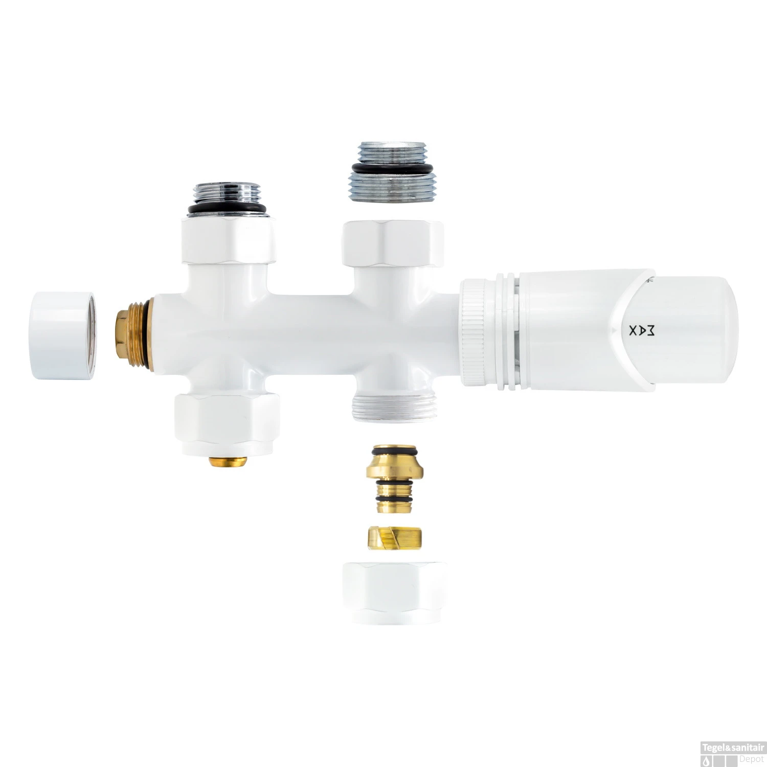 De set komt met een recht onderblok, een thermostaat knop en twee verloopringen met een schroefdraad van 3/4 inch naar 1/2 inch.