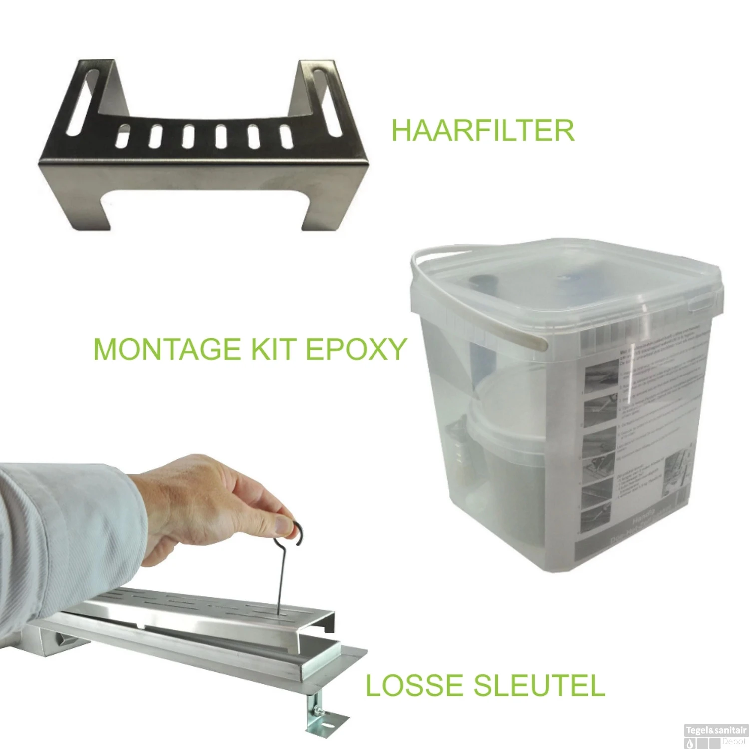 Het voordeel van de douchegoot is dat u het sifon eruit kan halen om schoon te maken. Met een extra haarfilter kunt u de goot nog schoner houden en u voorkomt hiermee verstopping. De sifon is slechts 6.7cm diep (geïntegreerd).