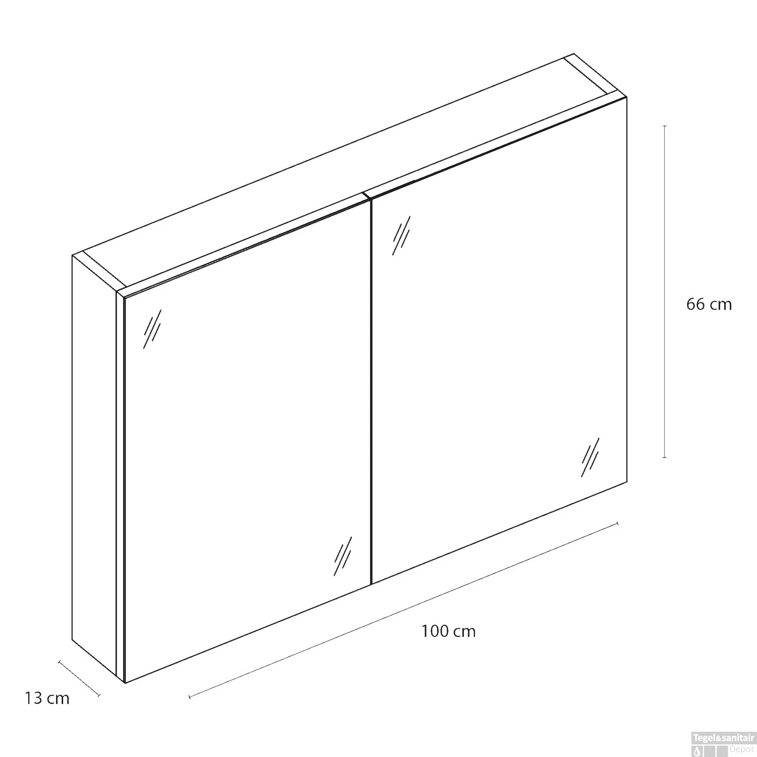 De spiegelkast is voorzien van twee deuren met daarachter twee verstelbare plankjes. Hierdoor kunt u met gemak uw veel gebruikte toiletartikelen kwijt, zoals een deodorant, parfum of een haarborstel. De spiegel heeft een breedte van 100 cm, een diepte van 13cm en een hoogte van 66 cm.