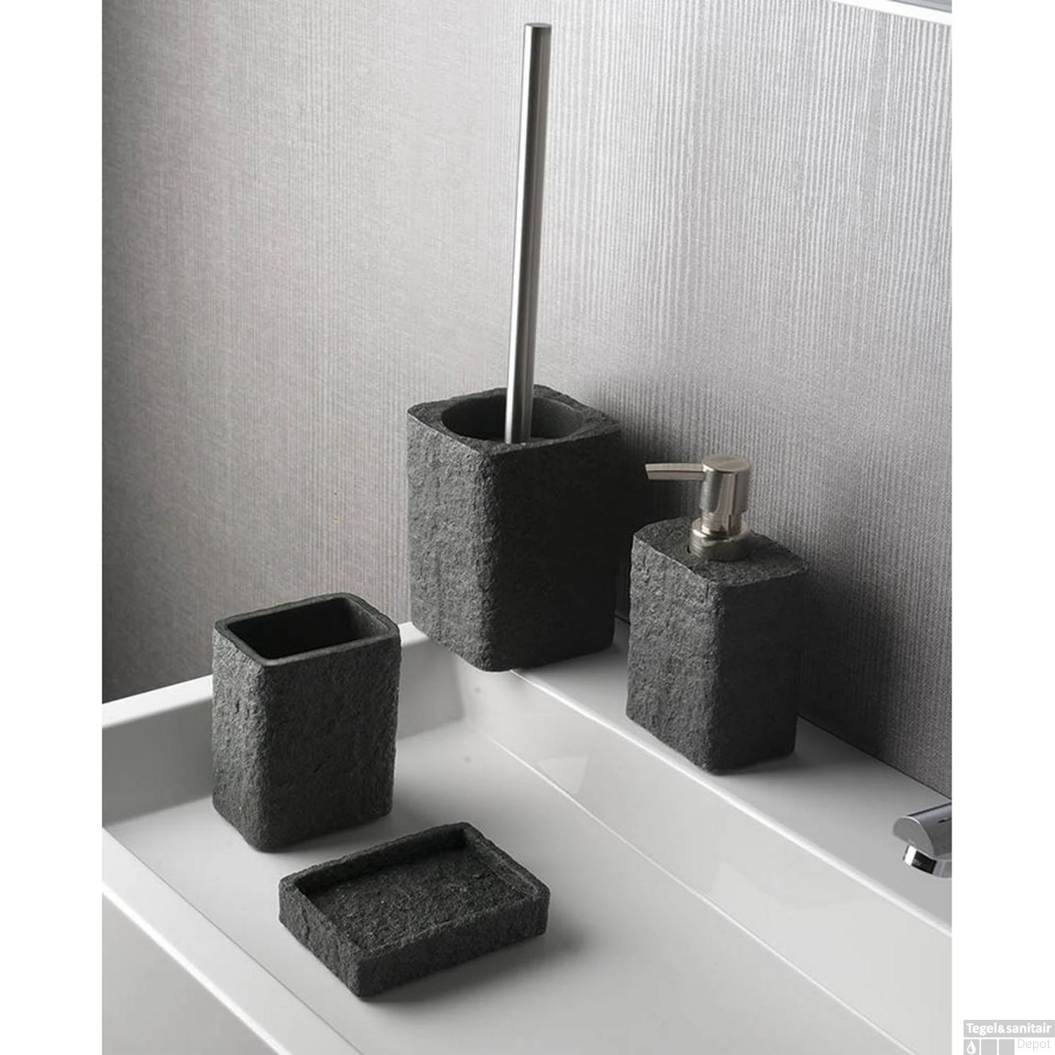 Door de eenvoudige vormgeving past de tandenborstelhouder in elke badkamer of toilet. De tandenborstelhouder is gemaakt van Polyresin en is uitgevoerd in de kleur antraciet (steen look). Het betreft een staande tandenborstelhouder die zodoende eenvoudig te verplaatsen en schoon te houden is.
