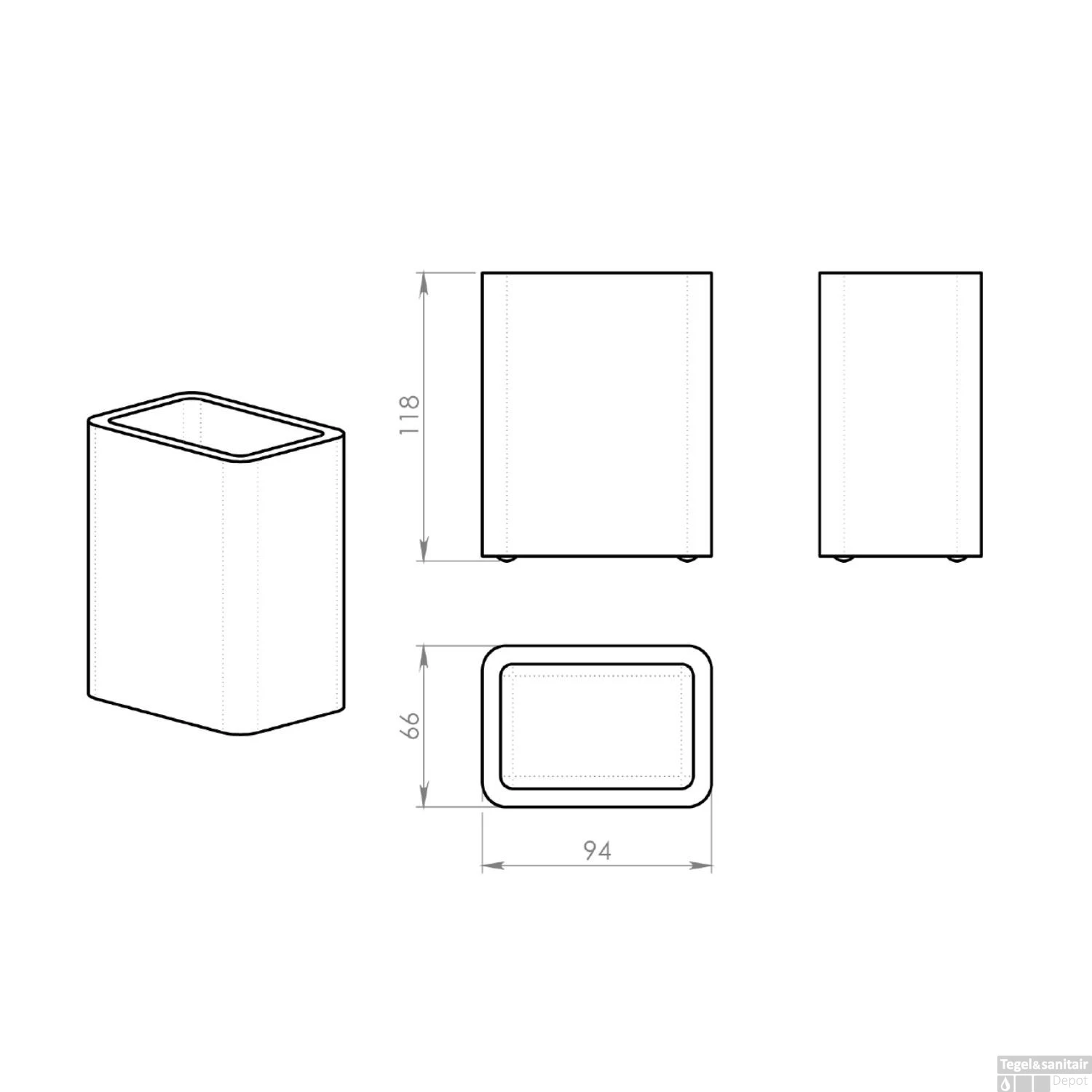 De tandenborstelhouder heeft een hoogte van 11.8 cm, een breedte van 9.4 cm en een diepte van 6.6 cm.