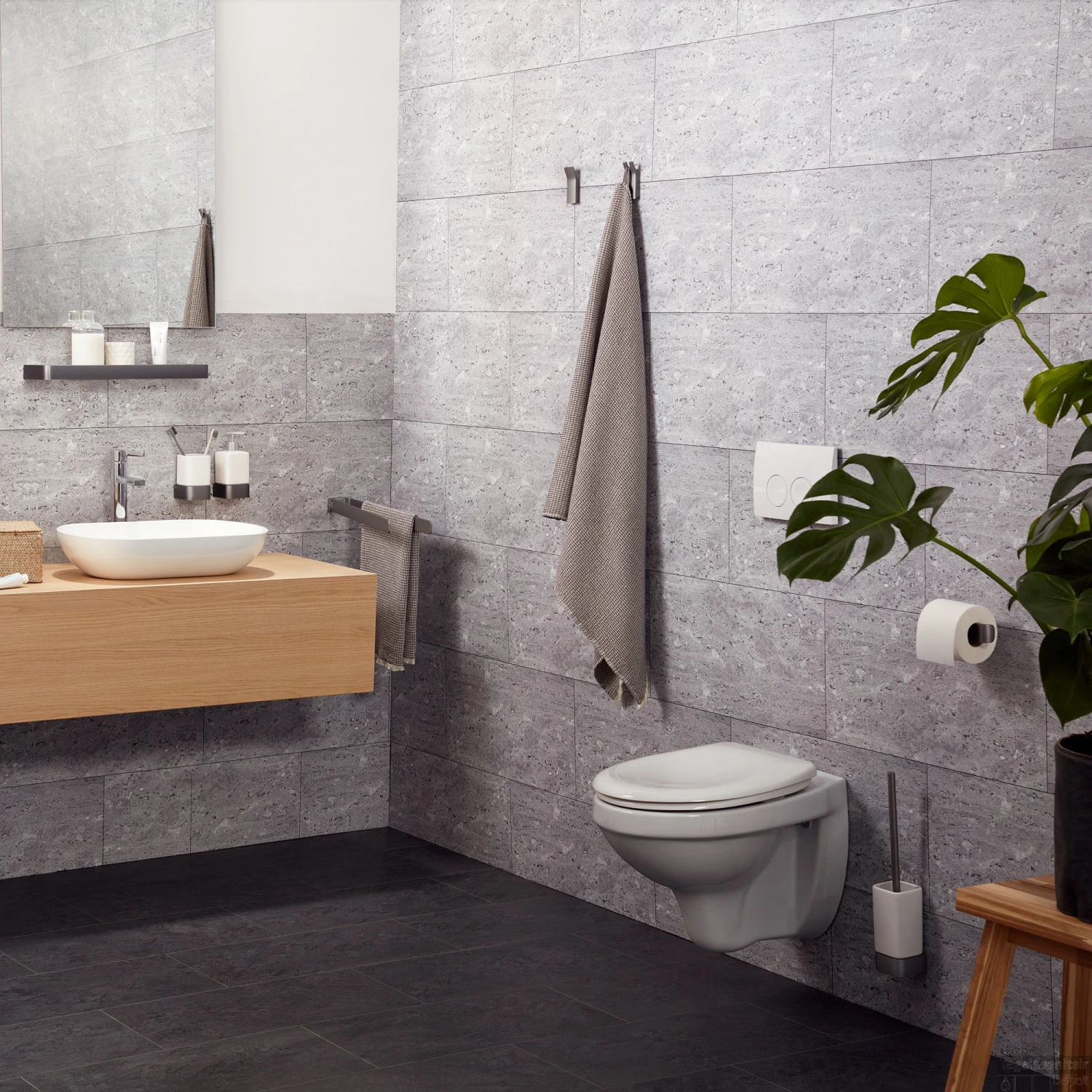De ‘Aline Grey’ toiletrolhouder van het merk Haceka is gemaakt van aluminium en is afgewerkt in de kleur mat grijs, waardoor dit artikel een stijlvol en uniek design heeft. De toiletrolhouder heeft een breedte van 15,6 cm en een hoogte van 3,5 cm. De toiletrolhouder dient aan de muur bevestigd te worden: dit kunt u het beste doen met de bijbehorende montagelijm, die u onderaan de webpagina aan uw bestelling toe kunt voegen.