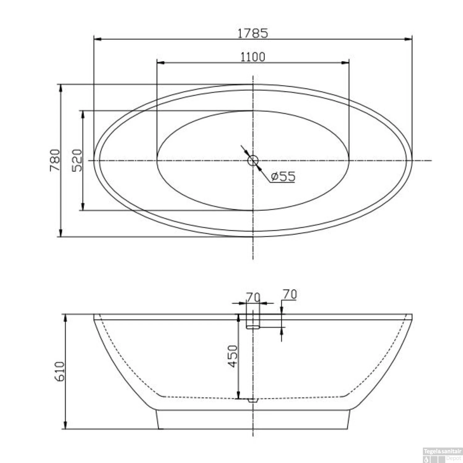In het bad zit een overloop met een chromen click-waste en wordt geleverd inclusief sifon.