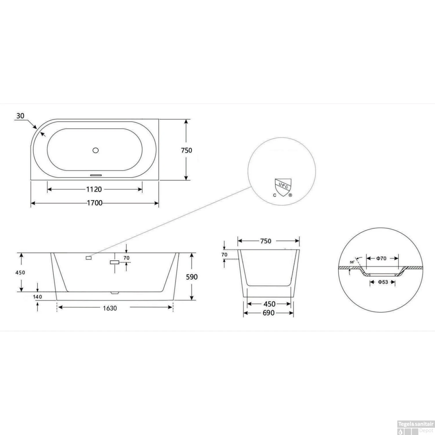 Specificaties Vrijstaand Hoekbad Boss & Wessing Aloni Links 170×75 Wit: