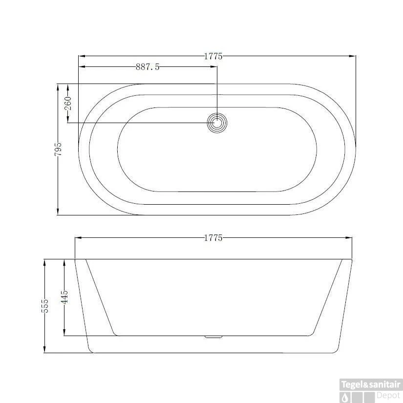 Het vrijstaande band wordt geleverd met badpoten en badafvoer. De afmetingen van het bad zijn Lengte 178 cm de Breedte 80 cm en de Hoogte 55 cm.