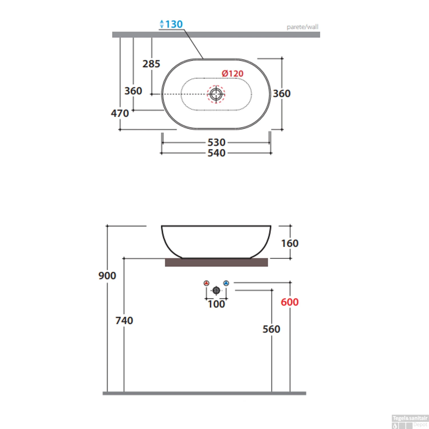 De kom is 16 cm hoog, 54 cm breed en 36 cm diep. Zonder overloop en waste.