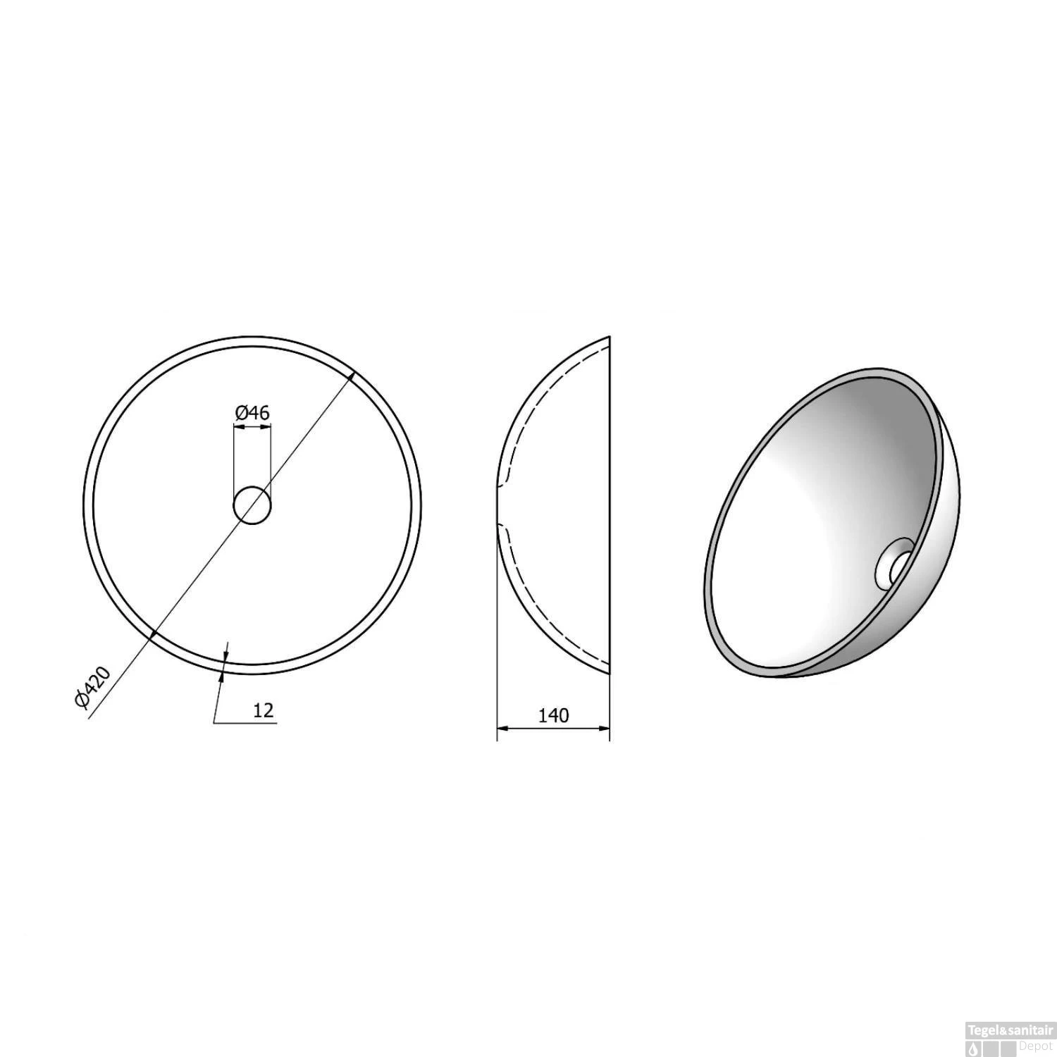 Met een hoogte van 14 cm kunt u gebruik maken van hoge wastafelkraan of een inbouw wastafelkraan, een geschikt model vindt je onder de toebehoren. De waskom heeft een diameter van 42 cm met randdikte van 1.2 cm. Er is geen overloop ingebouwd in deze waskom.