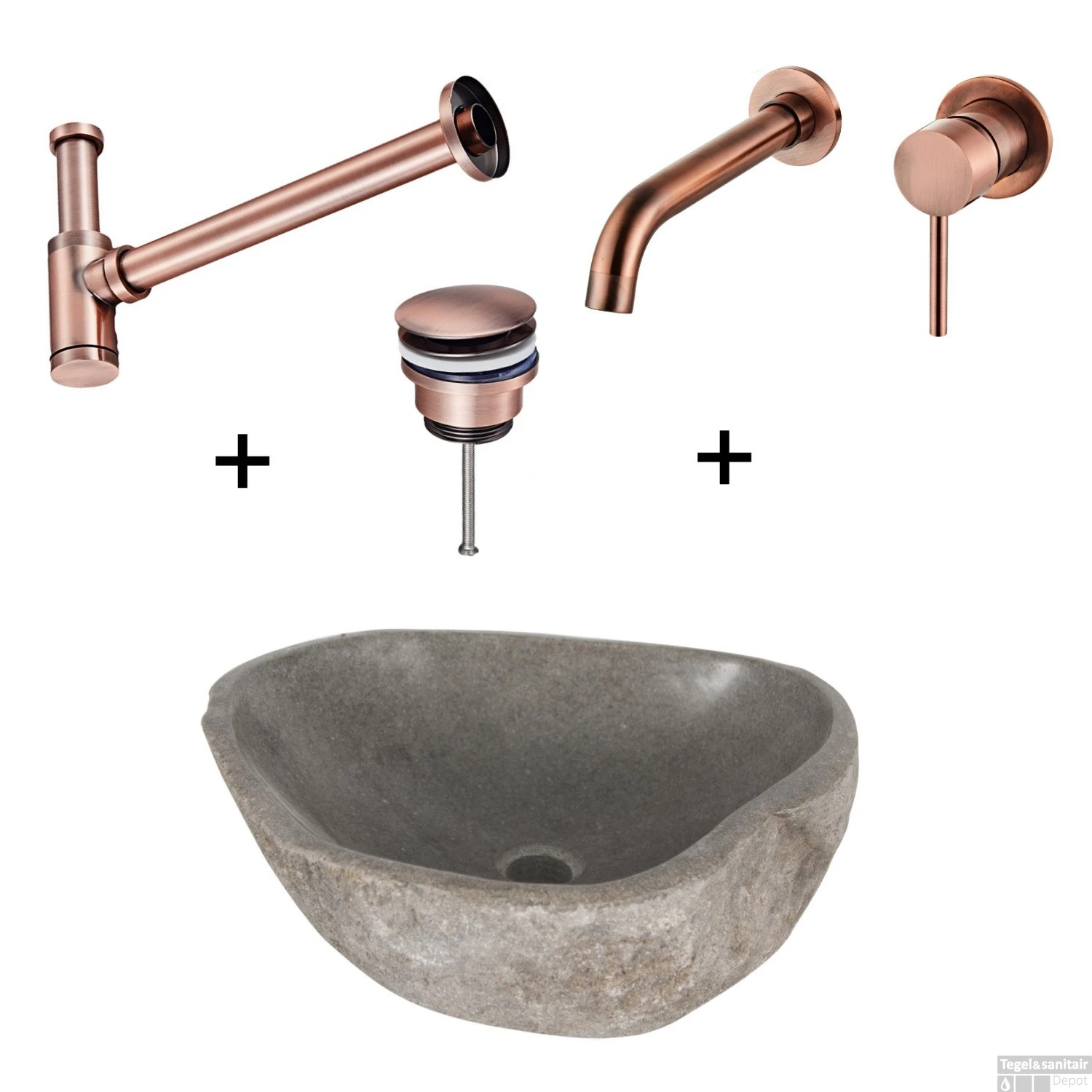 Meegeleverd in de set is een koper kleur inbouw kraan Boss & Wessing. Naast een Koper kleurige kraan worden er ook een sifon en clickwaste in dezelfde kleur meegeleverd. Dit betekent dat u het alleen hoeft aan te sluiten en de set daarna direct in gebruikt kunt nemen.