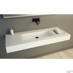 Deze wastafel is geproduceerd in de kleur mat wit en heeft een rechthoekige vorm. De hoogte van deze wastafel bedraagt 11 cm, de diepte 48 cm en de breedte 120 cm. Het matte, fluweelachtige oppervlak van de wastafel voelt prettig aan en is makkelijk schoon te maken en te onderhouden. Het artikel wordt geleverd met een bevestigingsset. Het water wordt afgevoerd door een smalle goot op de bodem van de wastafel.