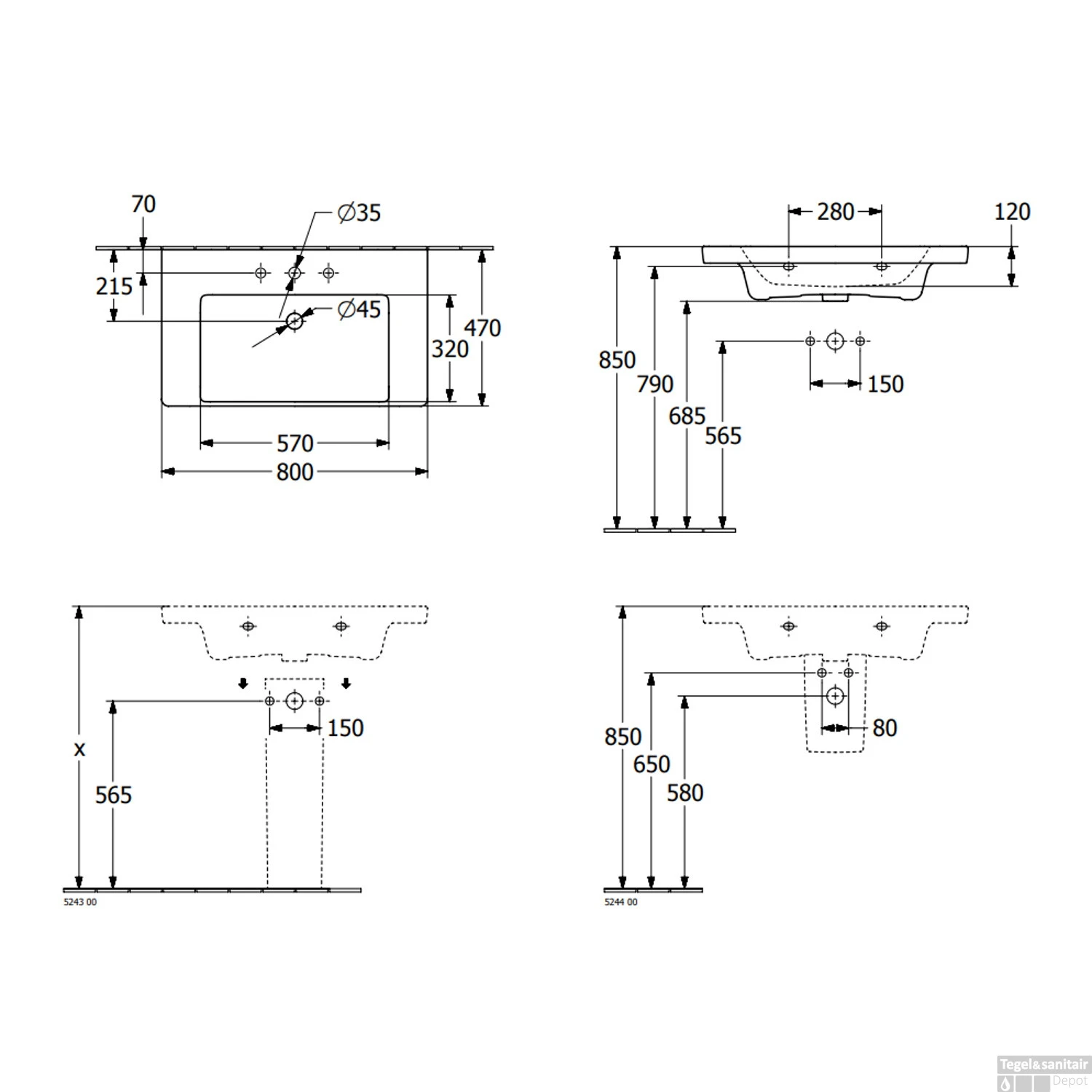 Specificaties Wastafel Villeroy & Boch Subway 3.0 47x80x16.5 cm Wit Alpin