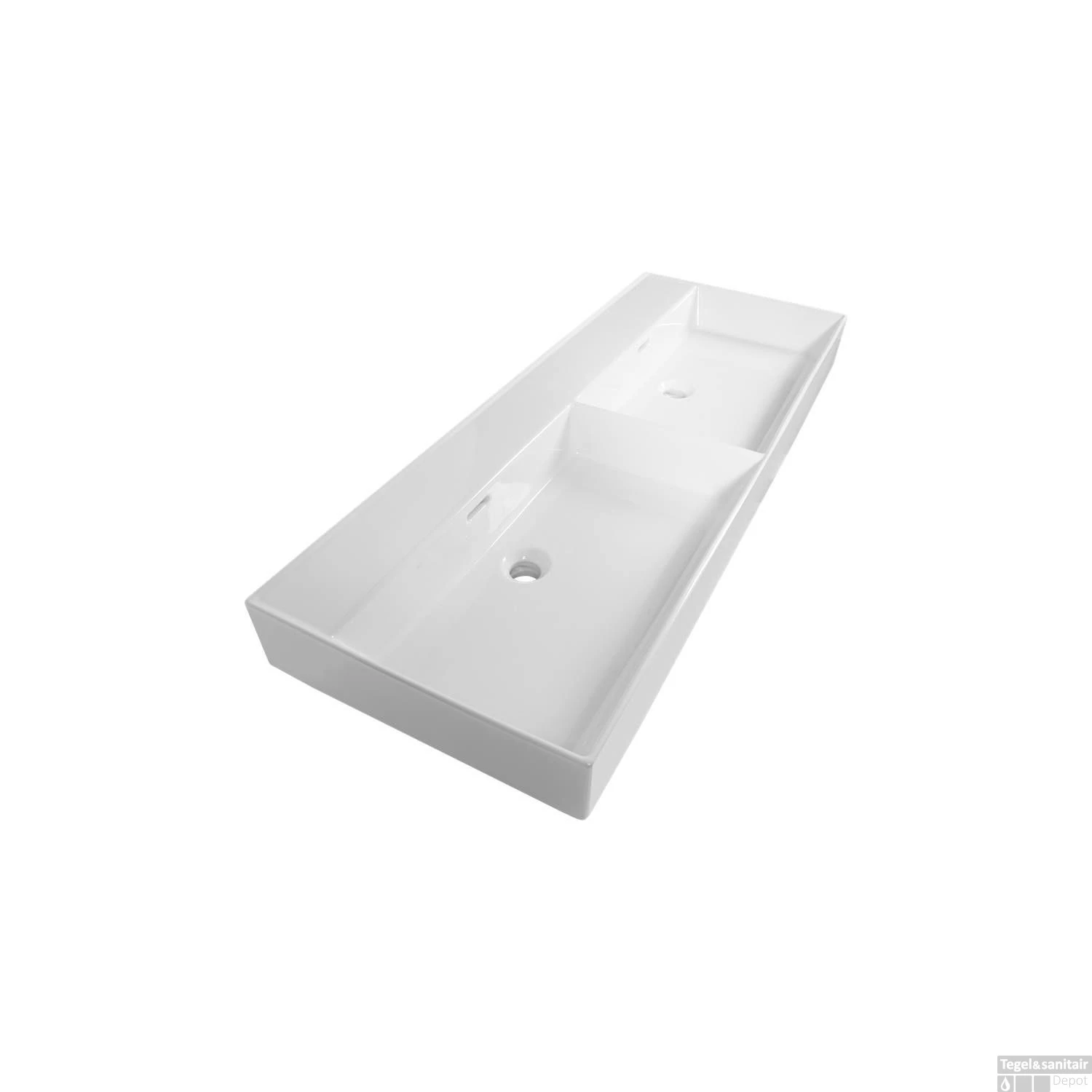 Het Legend wastafelblad is uitgevoerd in hoogglans wit keramiek. De wastafel is 121 cm breed, heeft twee rechthoekige wasbakken met een overloopgat en is mooi te combineren met een inbouwkraan. Verder geven de 13 cm hoge rand en hoekige vormen de wastafel een moderne look.
