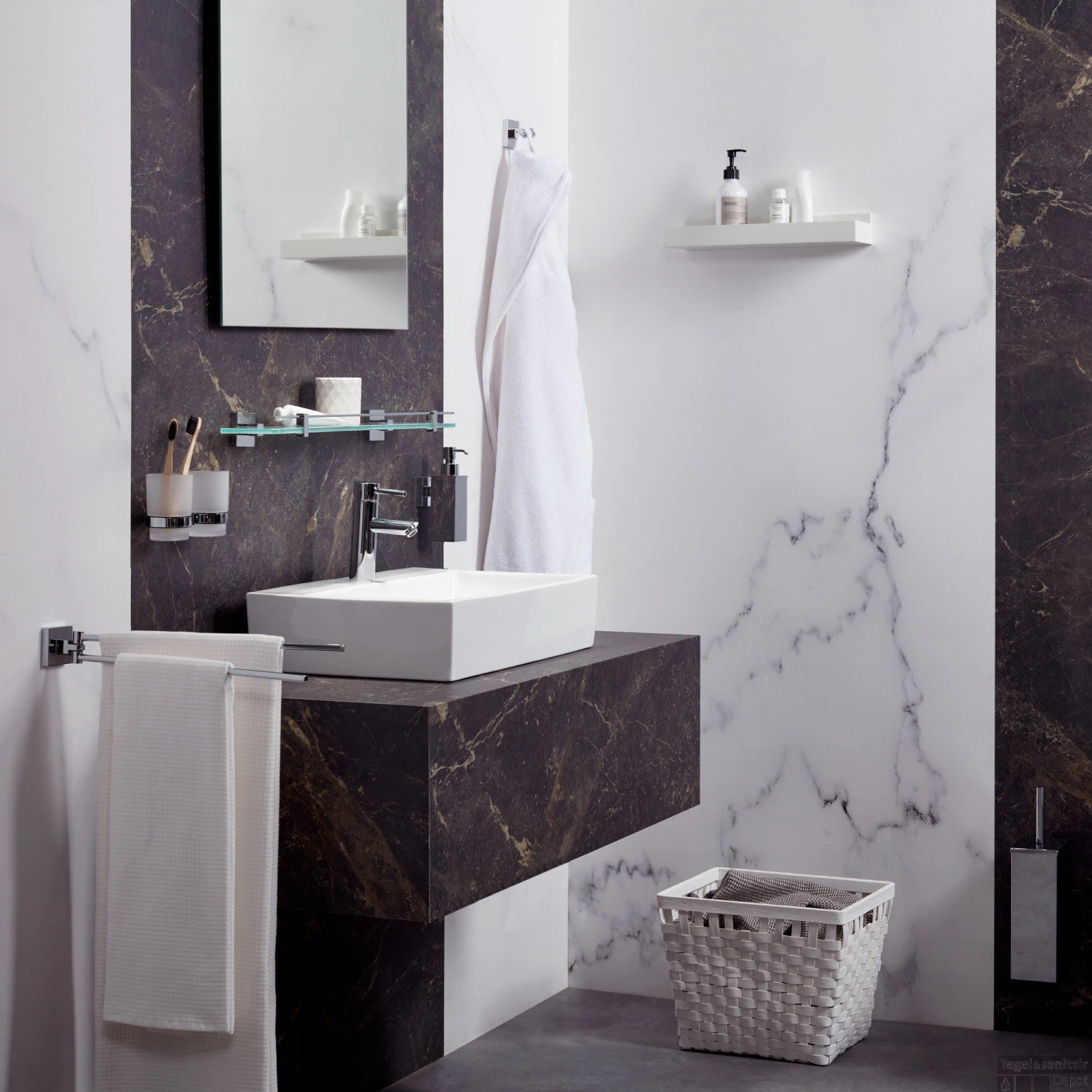 Zeer uitgebreide serie met kranen, accessoires, meubels en douchecabines. Modern design door de vierkante vormgeving. Voor de complete inrichting van de badkamer. Verkrijgbaar in chroom glanzend en matte RVS look (TEC).